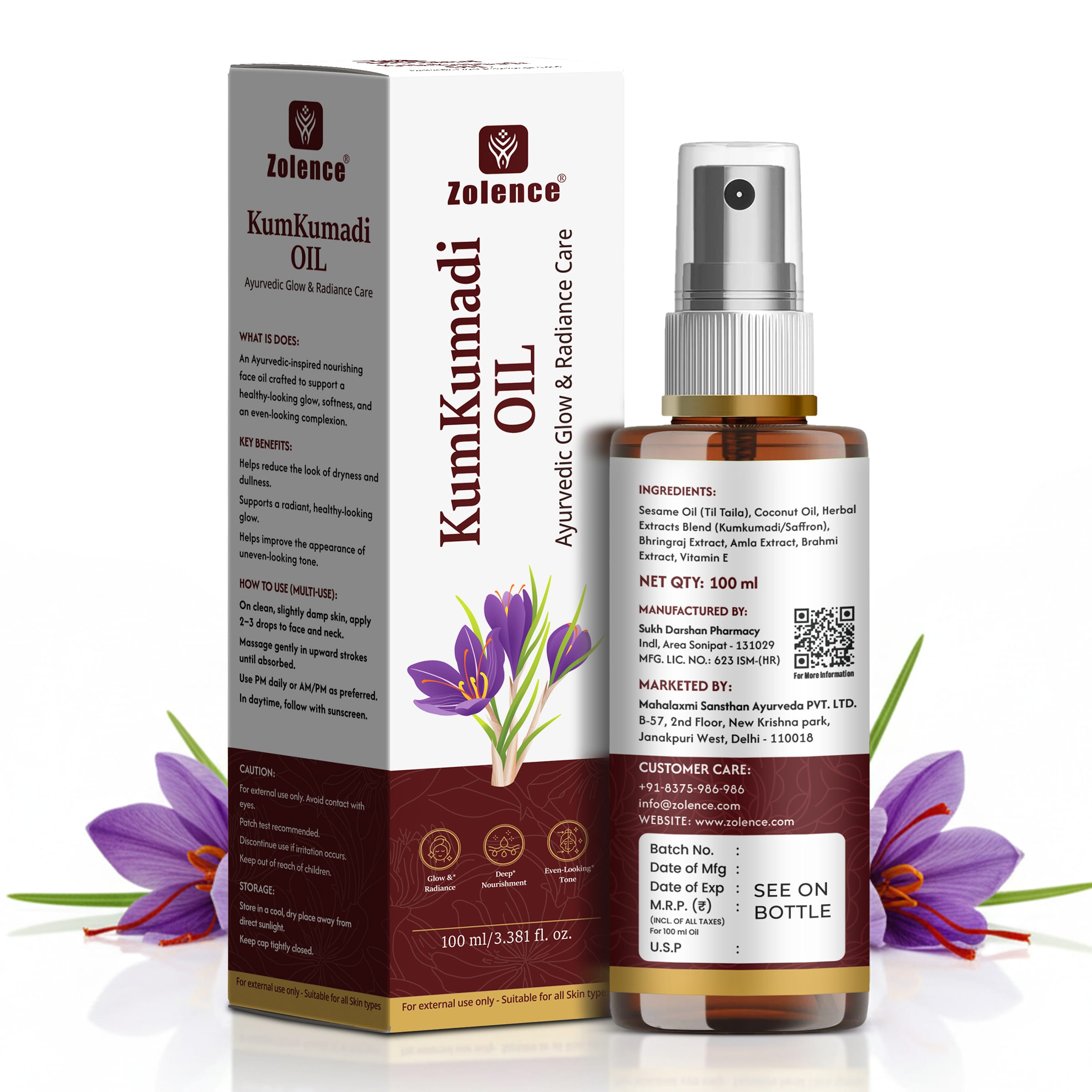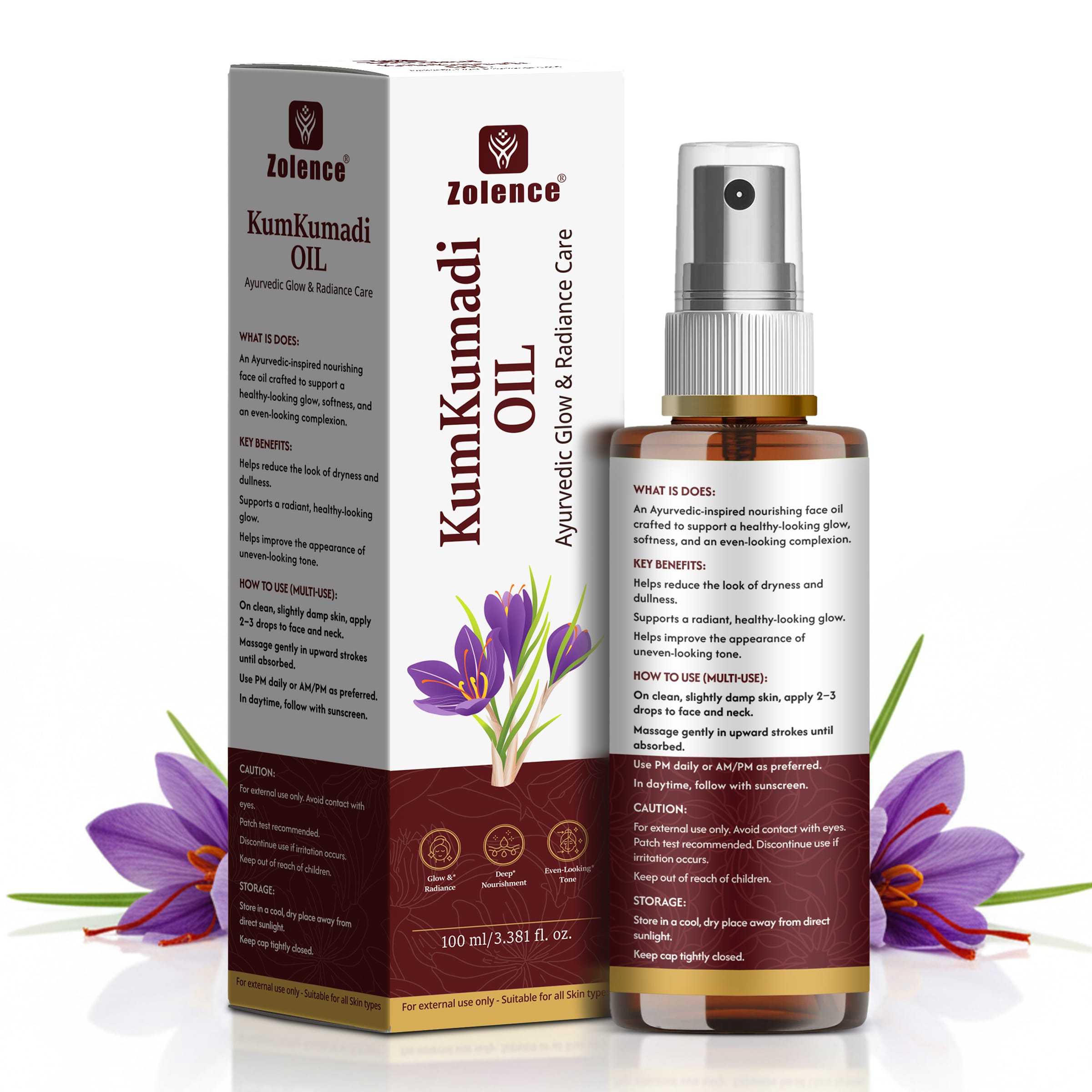 A powerful ayurvedic skin supplement, a rejuvenator endowed with 10 potent herbs and antioxidant elements. It declined the free radical to get rid of scars, dark spots and blemishes. It promotes blood circulation, scales down fine lines and wrinkles, console inflammation and irritation like itching and redness. It is also useful in managing dark circles appearing under the eye. Add Zolence Natural Kumkumadi Oil in regular routine to eliminate dullness and heighten skin brightening.