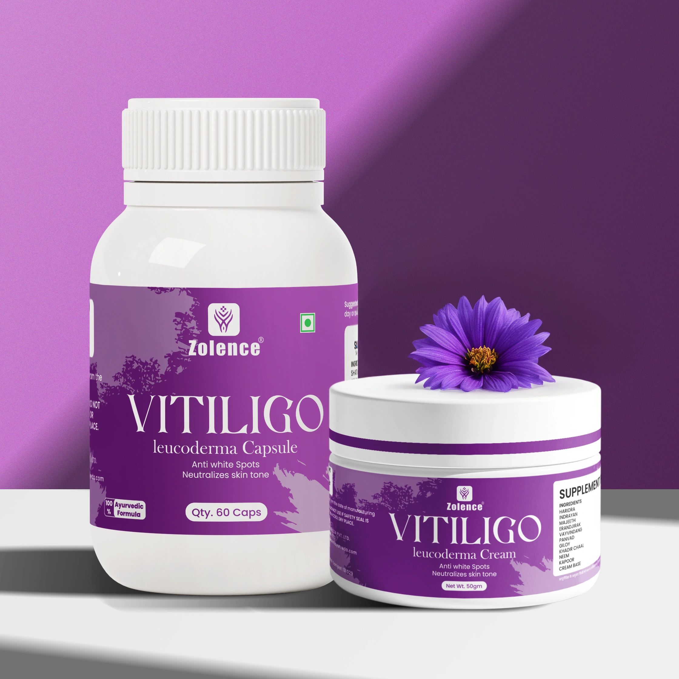 The Zolence Vitiligo Kit combines the wisdom of Ayurveda with modern formulation techniques to support skin pigmentation and help reduce the appearance of white patches, scars, and discoloration.
